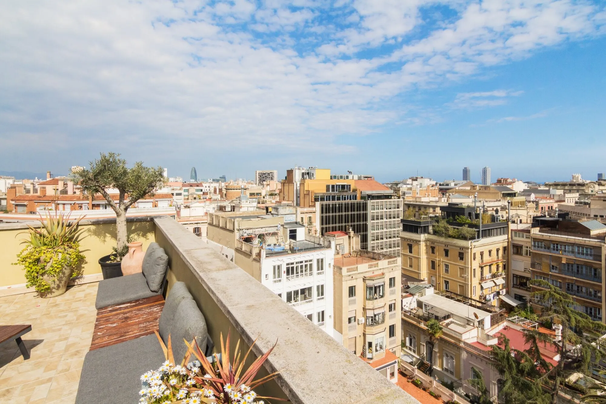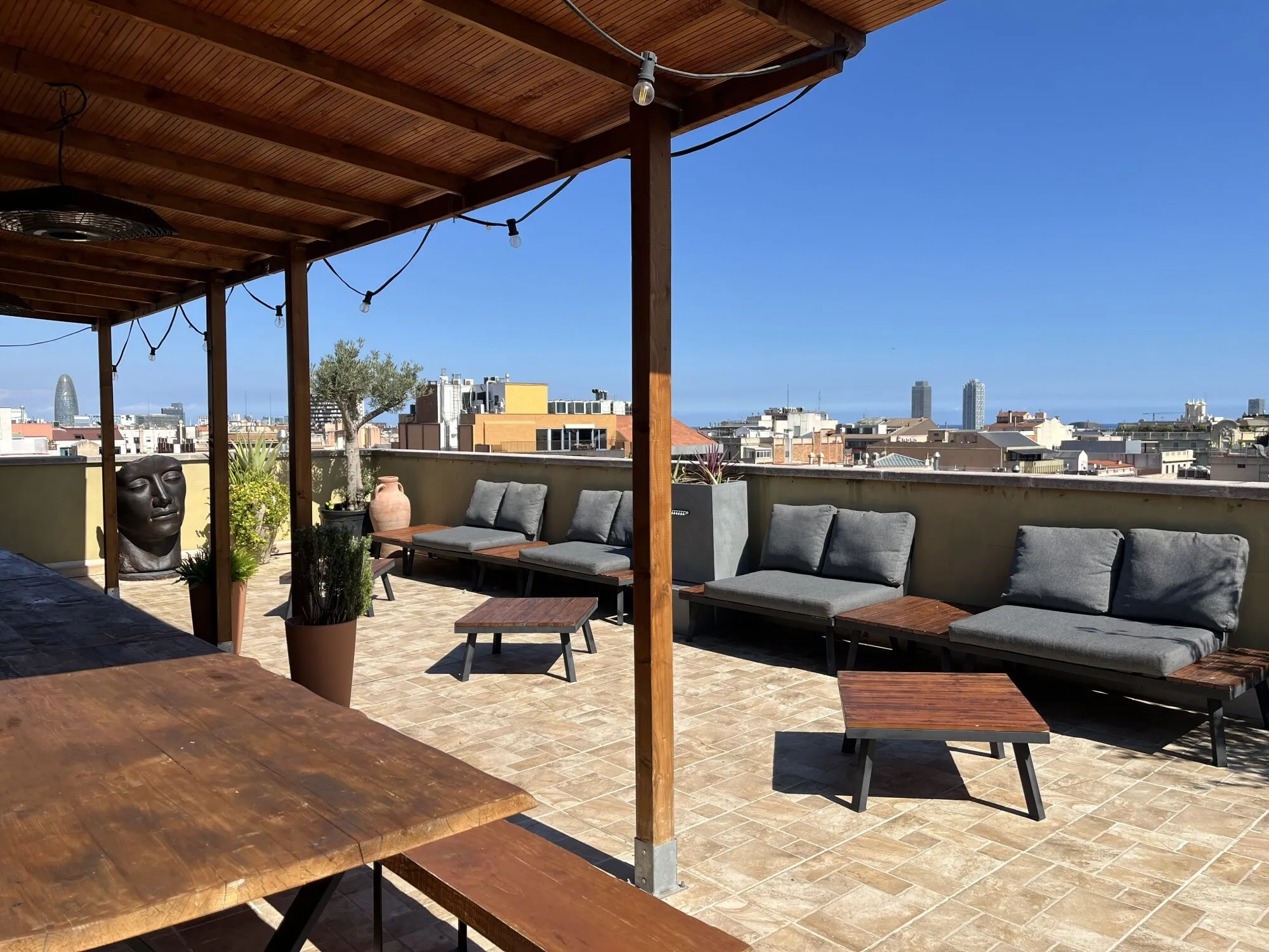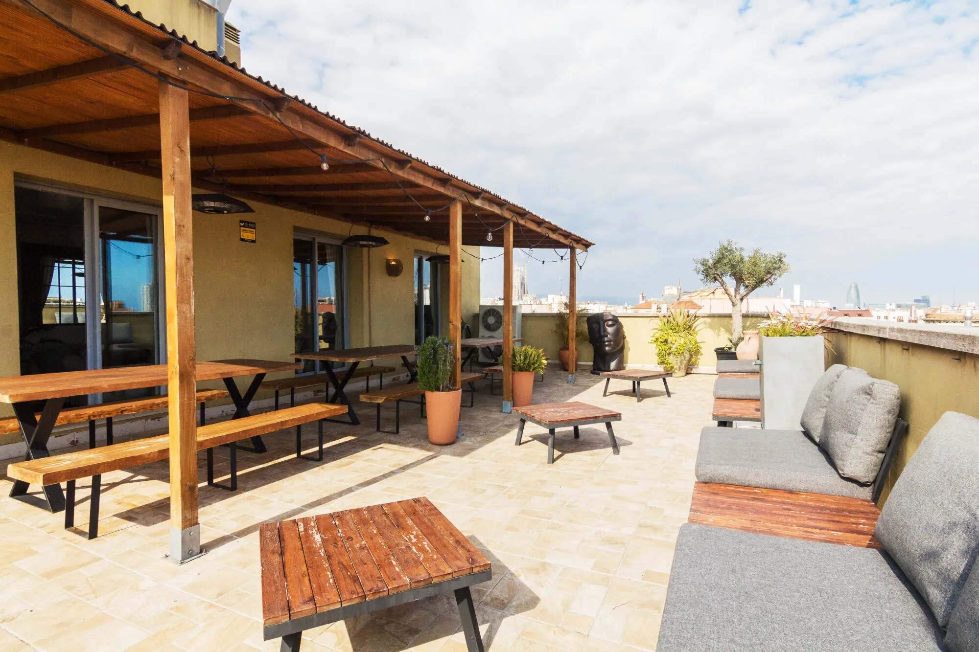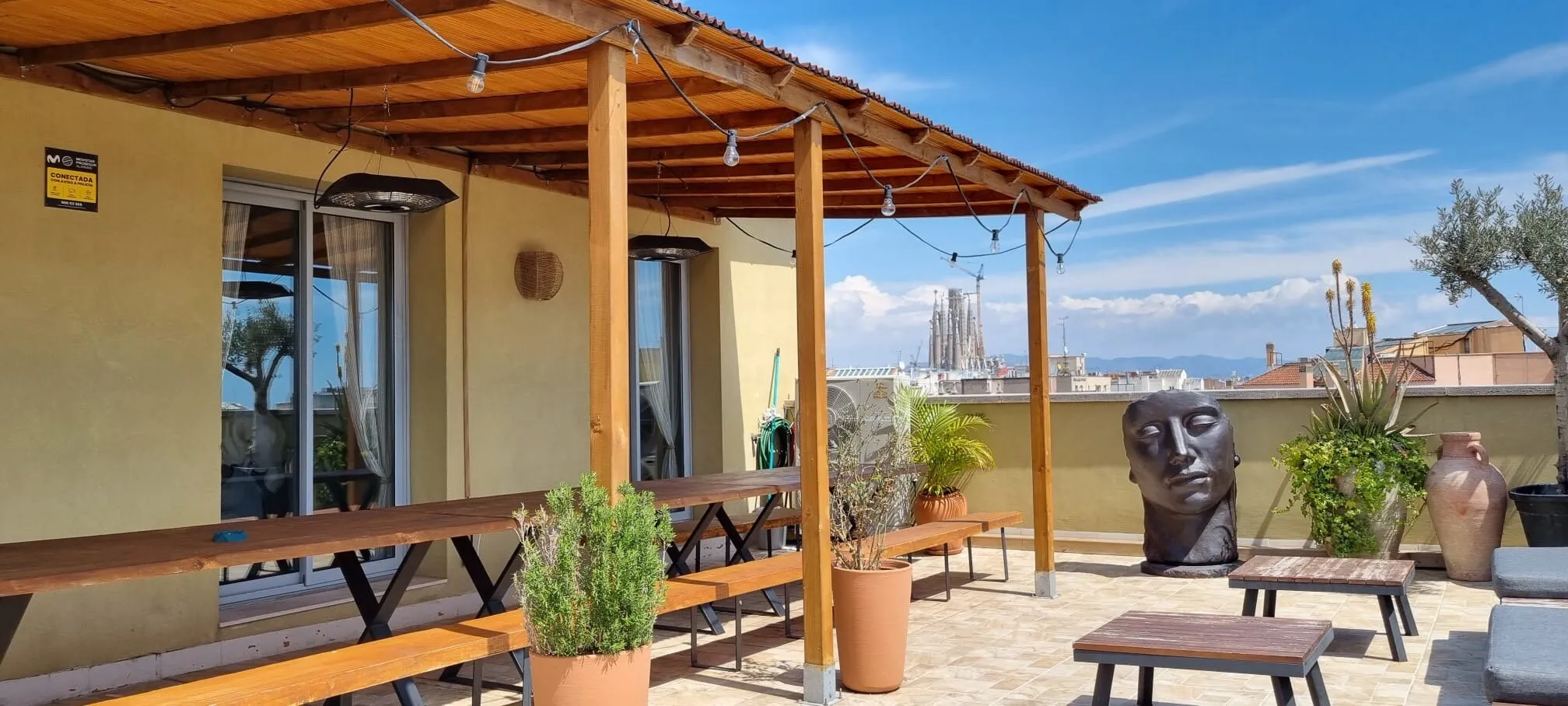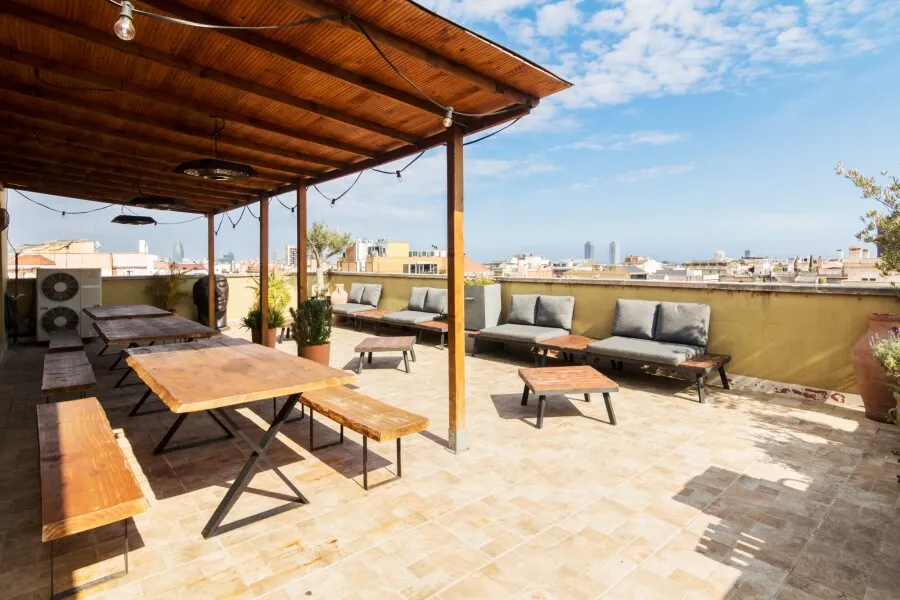 Ático Mediterráneo is located on the fourth floor of the building at Consell de Cent 334, right in the heart of Barcelona. It is a private venue that combines Mediterranean aesthetics with contemporary design and privileged views over some of the city’s most iconic landmarks, such as La Sagrada Familia, Tibidabo and Torre Glòries. The terrace has an approximate surface of 100 m² and is designed for year-round use thanks to its covered areas, outdoor heaters and versatile furniture that can be adapted to different event formats. The indoor area offers a bright, air-conditioned atmosphere, ideal for those who value privacy, comfort and a carefully curated setting in the city centre.