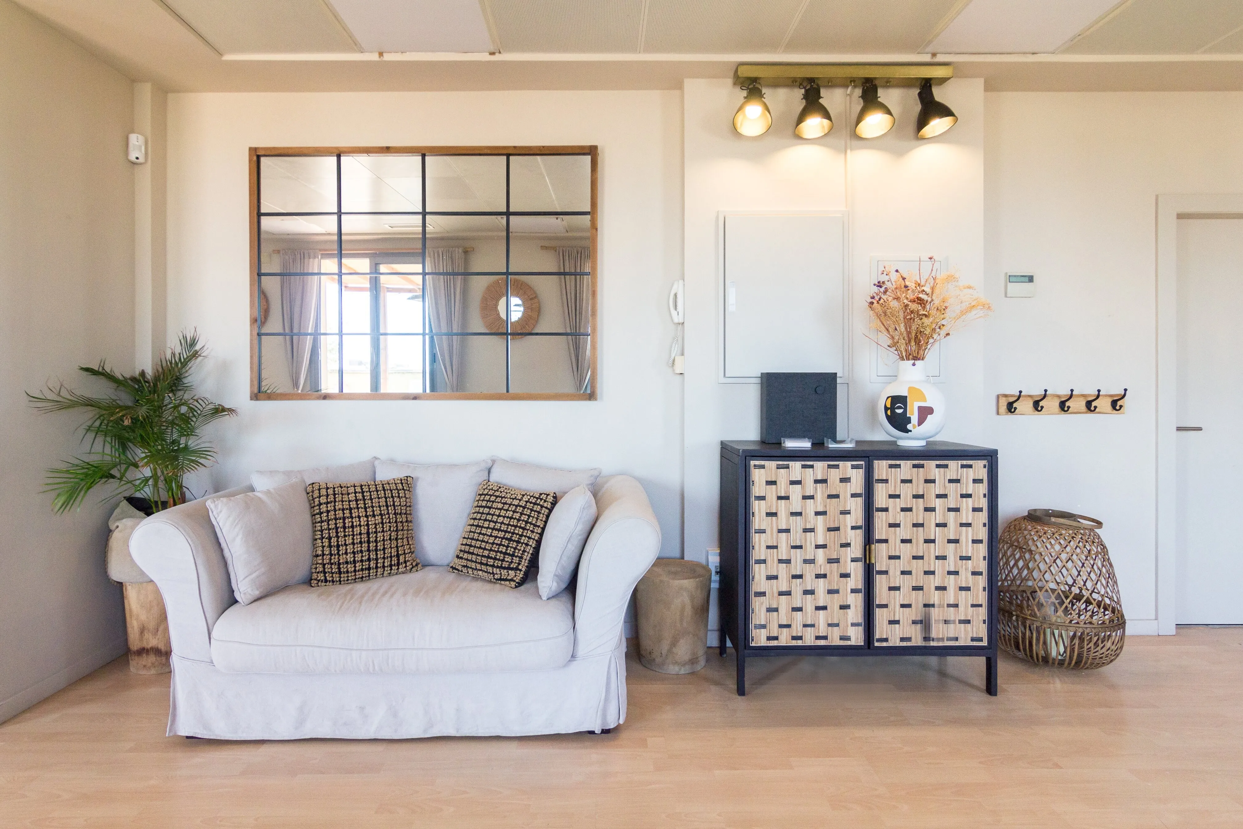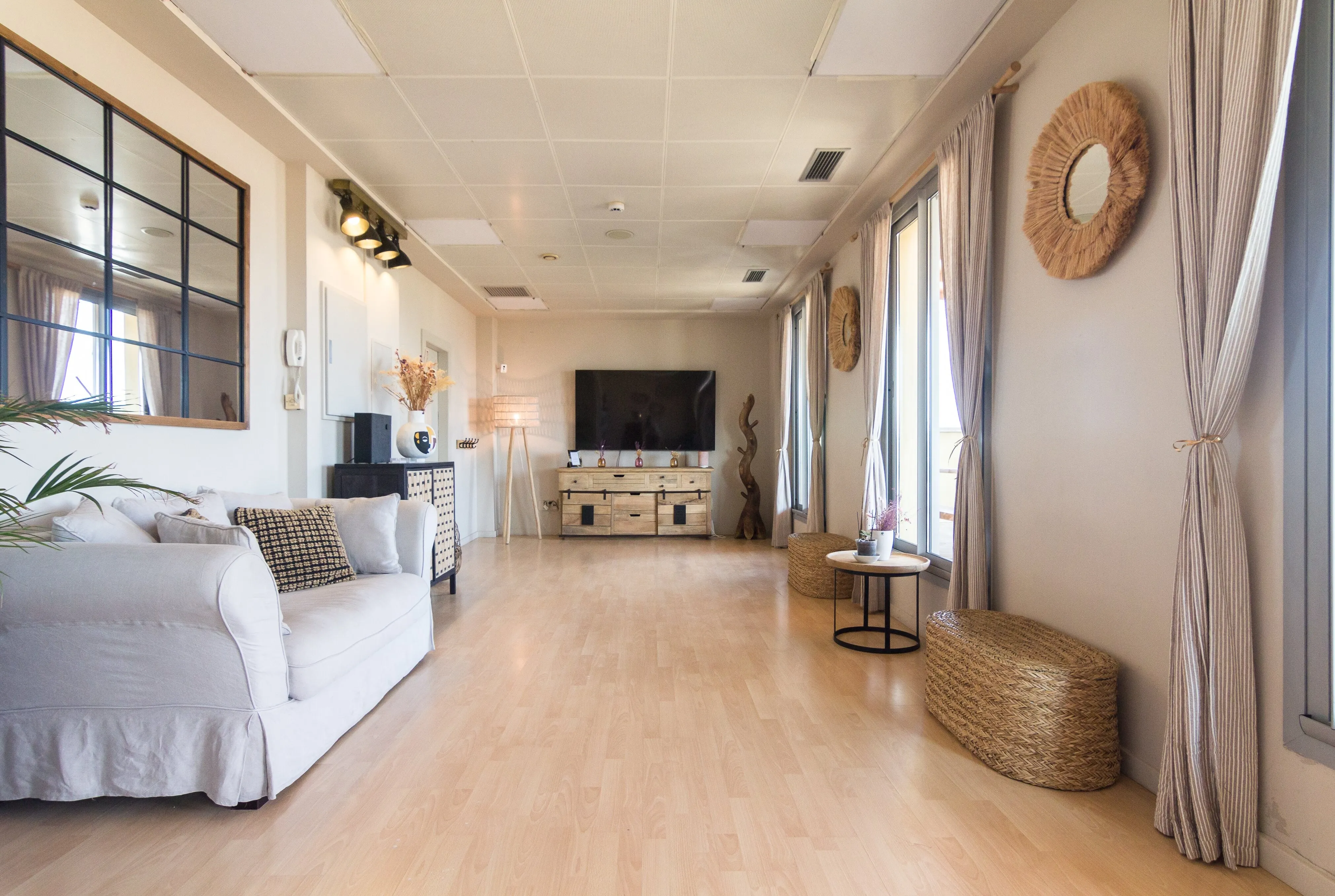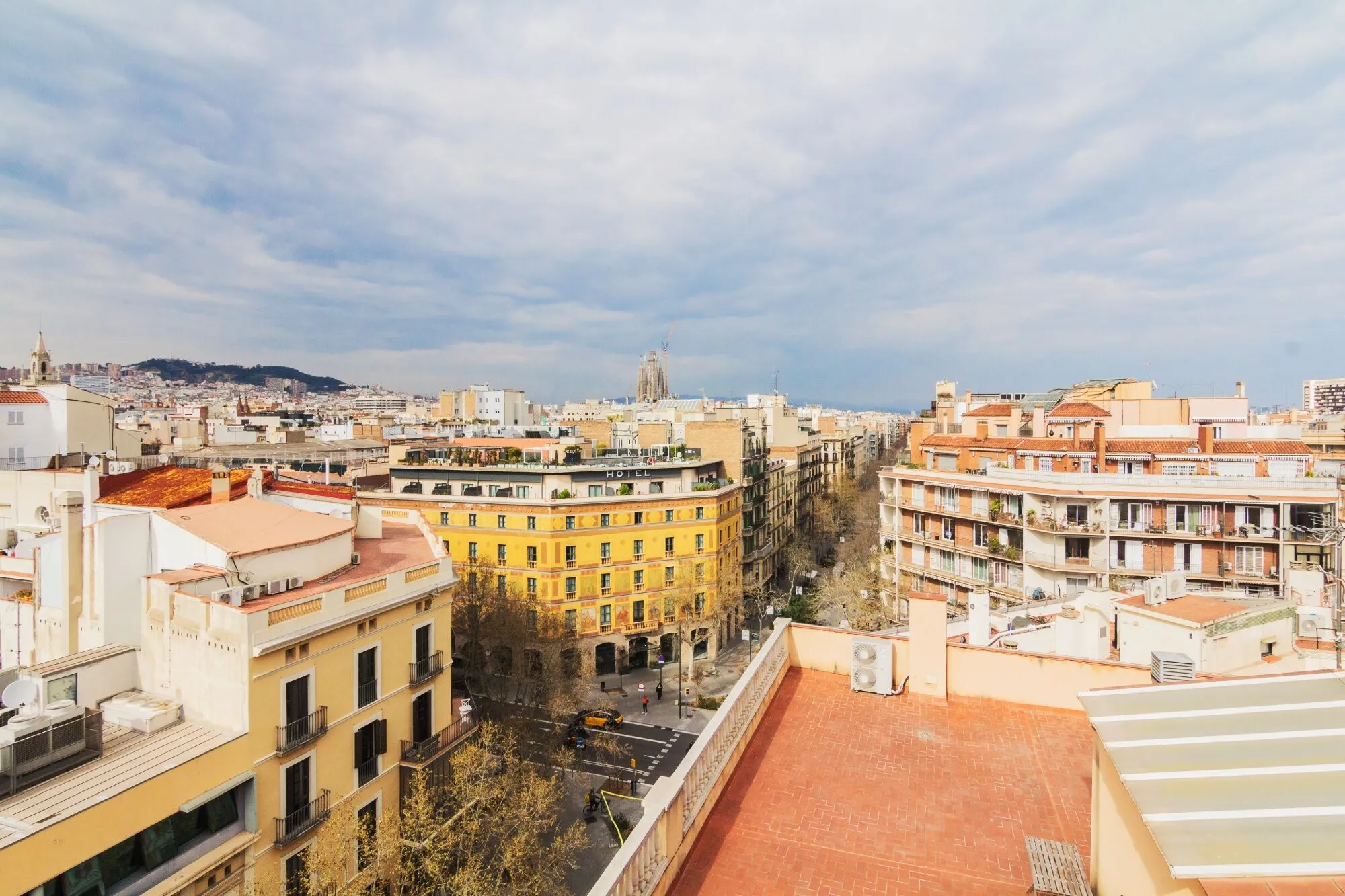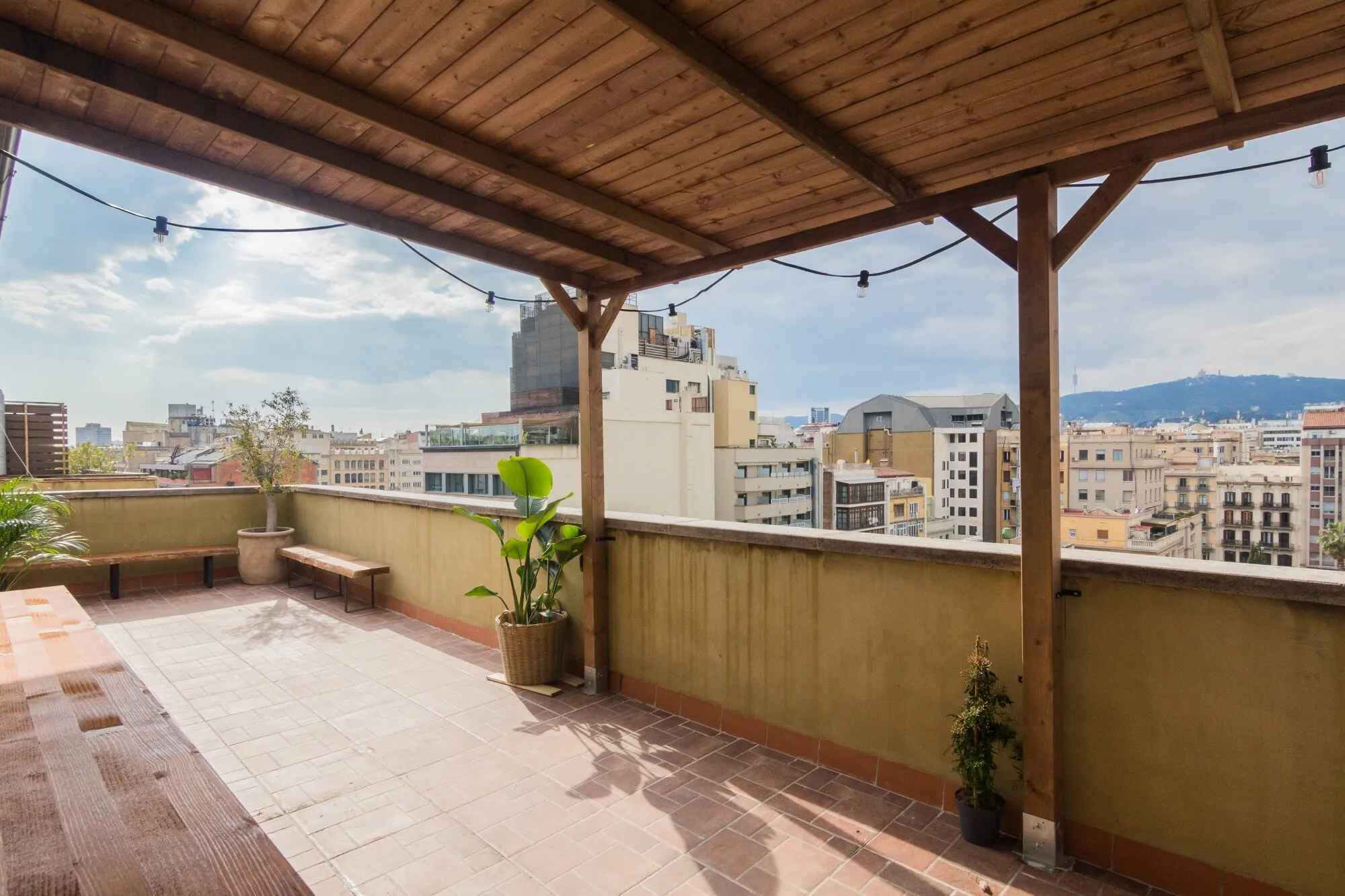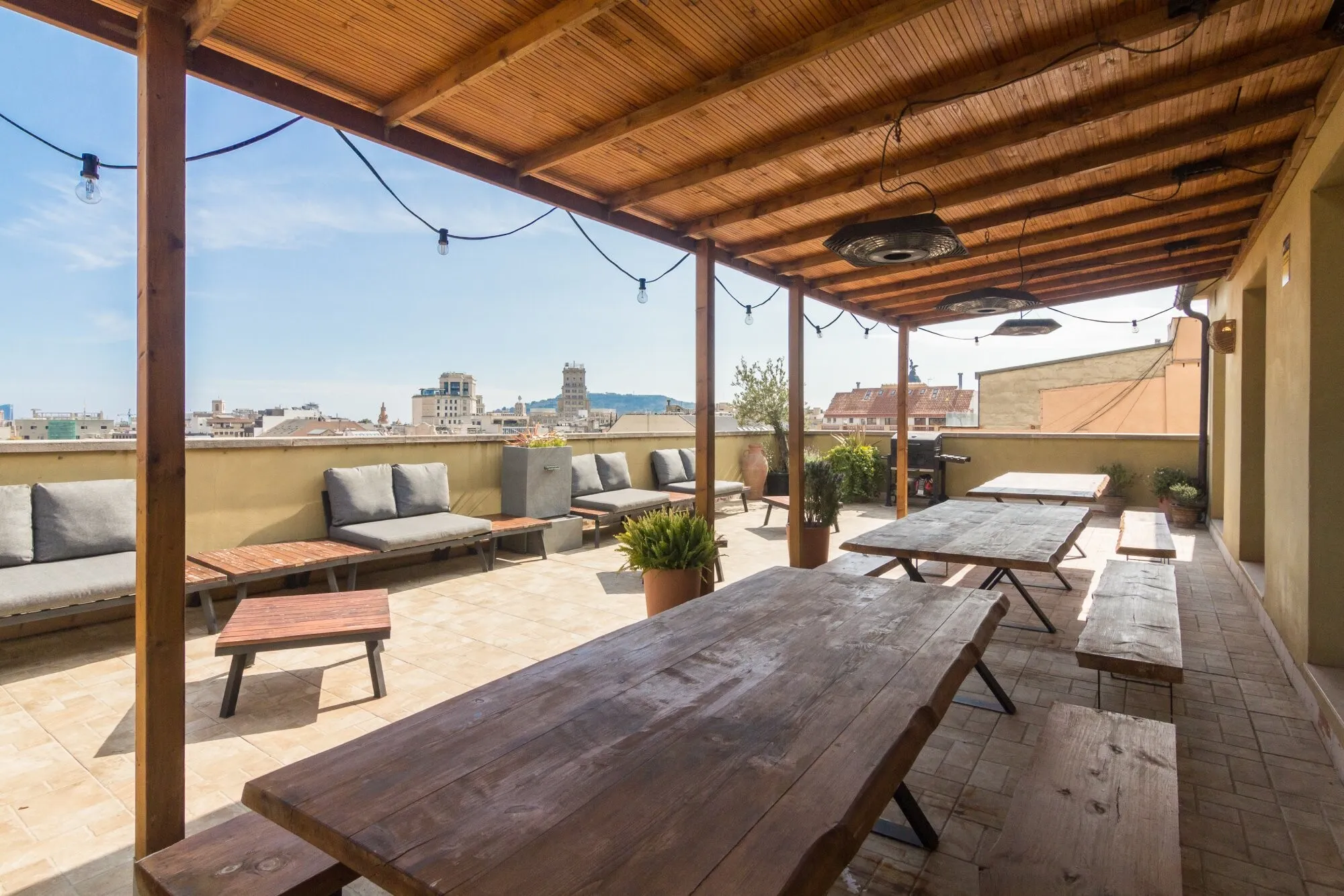 Ático Mediterráneo is located on the fourth floor of the building at Consell de Cent 334, right in the heart of Barcelona. It is a private venue that combines Mediterranean aesthetics with contemporary design and privileged views over some of the city’s most iconic landmarks, such as La Sagrada Familia, Tibidabo and Torre Glòries. The terrace has an approximate surface of 100 m² and is designed for year-round use thanks to its covered areas, outdoor heaters and versatile furniture that can be adapted to different event formats. The indoor area offers a bright, air-conditioned atmosphere, ideal for those who value privacy, comfort and a carefully curated setting in the city centre.