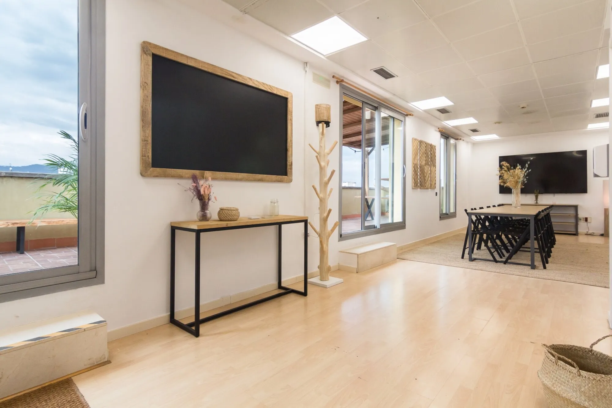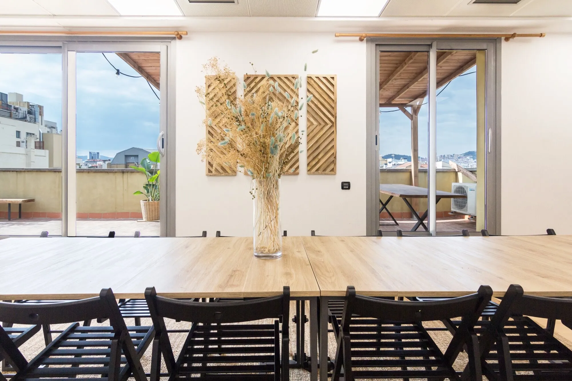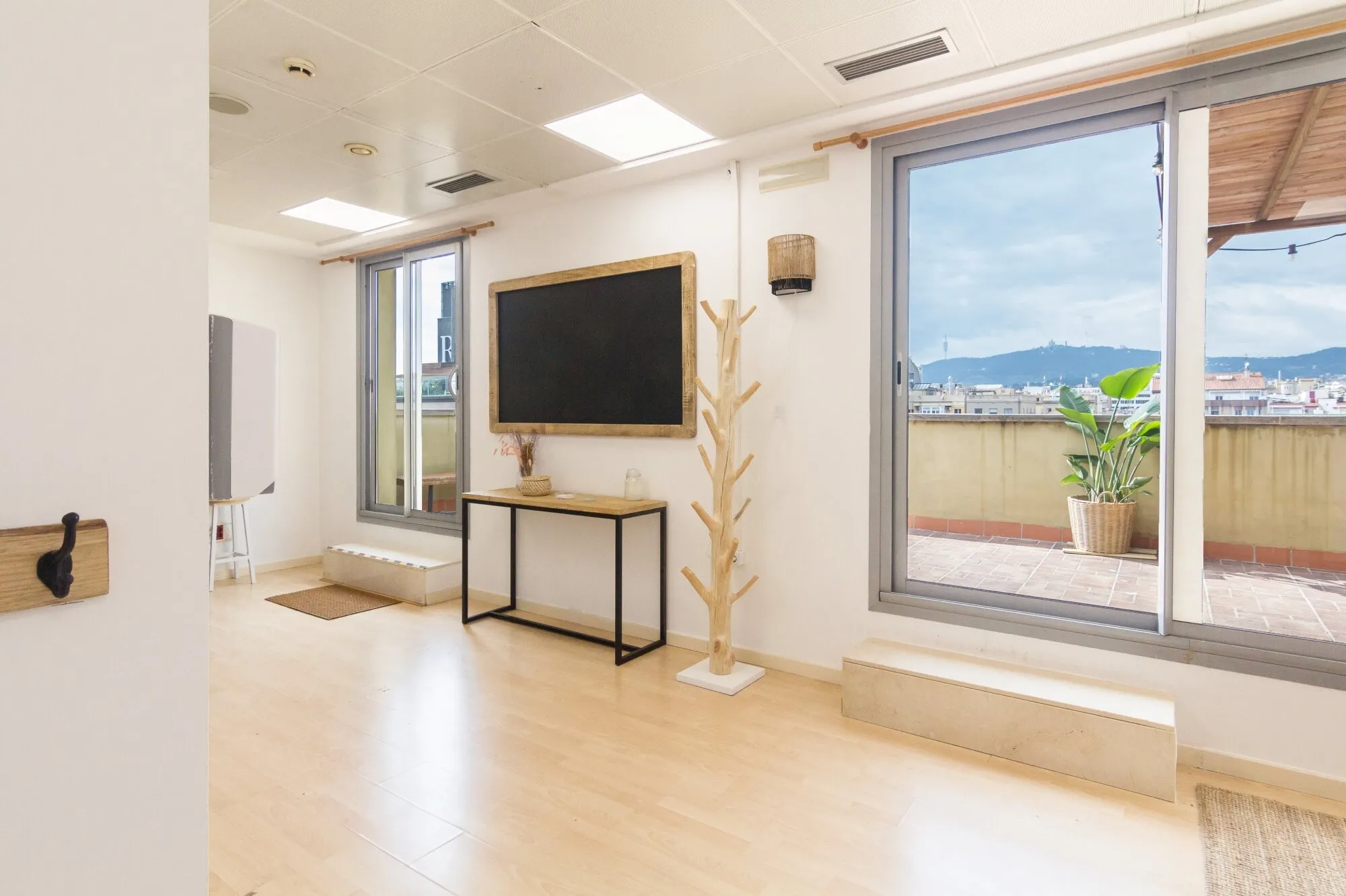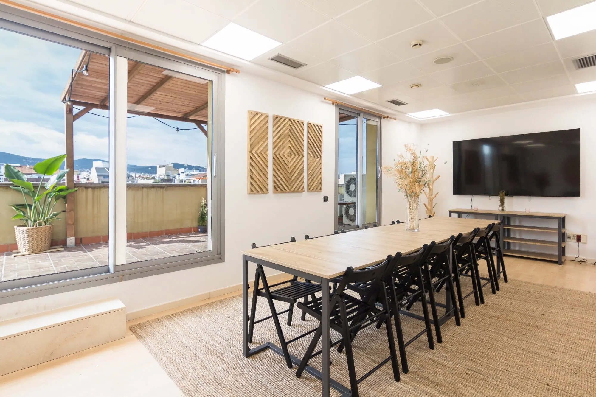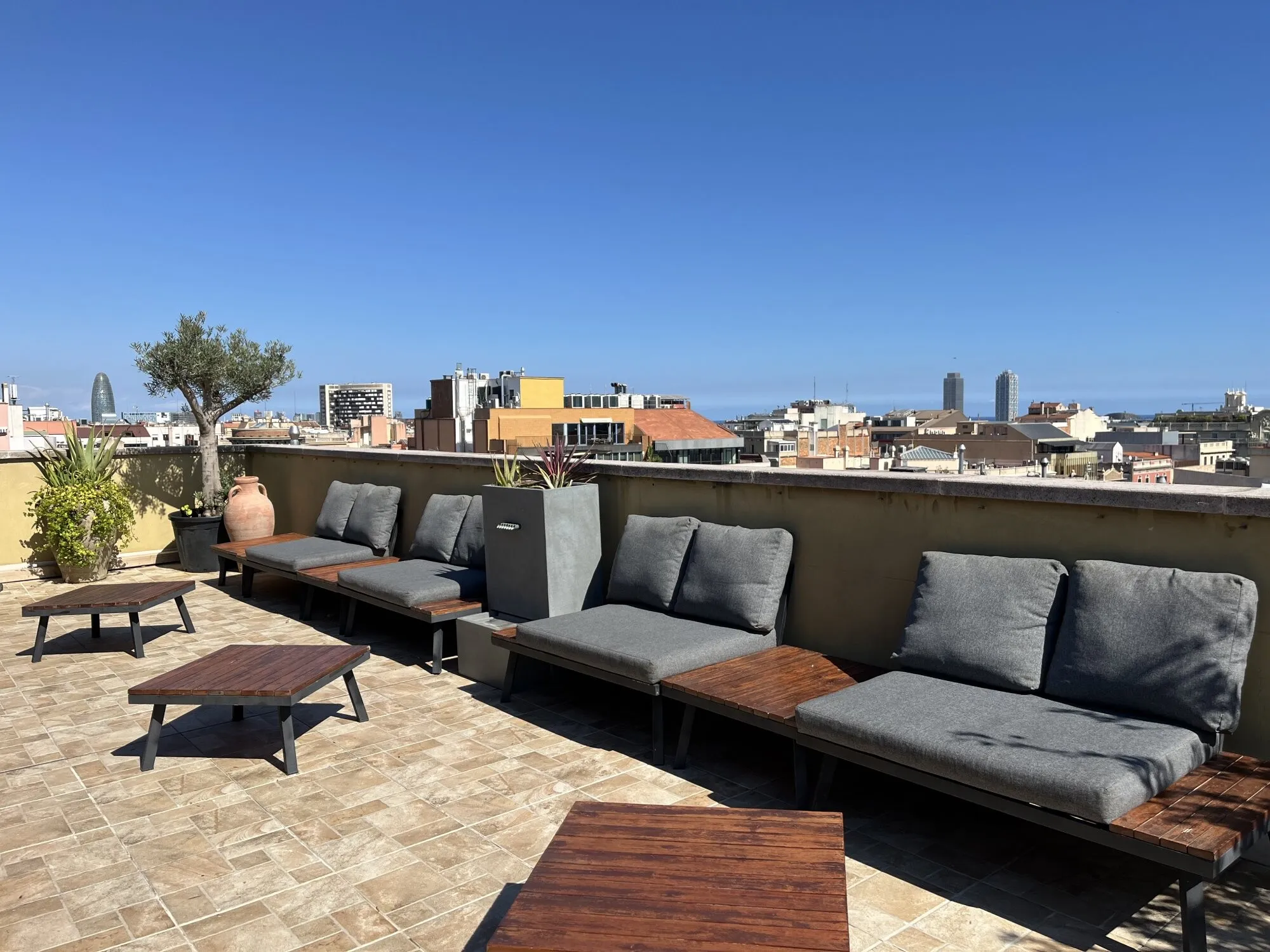 The main terrace can host up to 40 people, either seated or in cocktail or imperial table layouts. Its open configuration makes it an ideal setting for product launches, professional gatherings or receptions with the Barcelona skyline as a stunning backdrop. The indoor space, known as Sala Montaña, is an open-plan lounge with capacity for 30 to 35 guests, equipped with a large-format screen and sound system. Its direct connection to the terrace ensures a smooth flow between indoor and outdoor areas, encouraging interaction among guests and the natural development of the event. Ático Mediterráneo is rented on a full-day basis, with the possibility of use until 1:00 a.m., allowing events to be held at a relaxed pace and with full exclusivity.