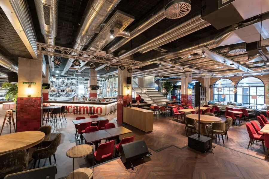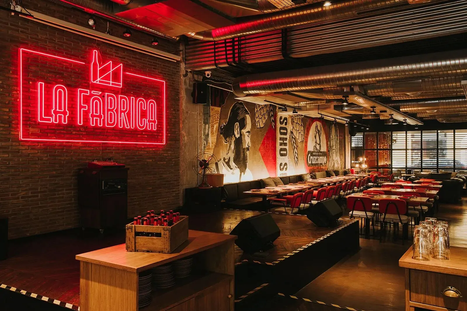 The venue features versatile areas that adapt to any format, from intimate and cozy settings to spacious, light-filled halls perfect for hosting large groups. In addition, its cultural programming—ranging from urban art exhibitions to live performances—reinforces La Fábrica’s distinctive character, ensuring that every event is not just hosted, but truly experienced.